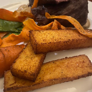 2) Michaelangelo's Big Sky. This restaurant is a MUST visit while in town. Although it is fifteen minutes outside the resort, in the lovely town of Gallatin, it is absolutely worth the drive. They offer a very creative Italian menu that will leave you longing for more, and more, and more. In addition, their safety protocols are outstanding; they booked out less than half of their capacity which allowed us to kick back and devour our delicious meals worry-free. For starters, we dove into the sautéed squid cooked in roasted tomato, garlic, and Pinot Grigio reduction along with an herb polenta topped with grilled portabella mushroom doused in drunken goat cheese. For our mains, we selected ricotta and black truffle stuffed pasta in black tartufata cream sauce, gnocchi in hazelnut pesto sauce, a ricotta cavatelli, elk chops, and a bison filet. Honestly, I think this is the first time in a long while that we literally licked our plates clean. The modern décor, excellent service, perfectly implemented Covid safety protocols and insanely delicious meals make this one of our most memorable dining experiences during our five months exploring the USA.